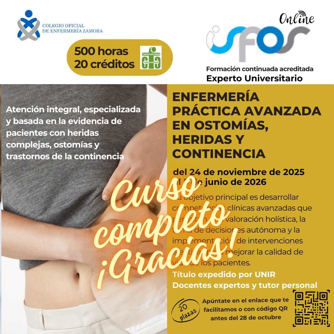 El Colegio de Enfermería junto con el Consejo General, en su afán de promover la investigación, va a financiar este curso de Experto Universitario ENFERMERÍA DE PRÁCTICA AVANZADA EN OSTOMÍAS, HERIDAS Y CONTINENCIA a 20 alumnos que quieran realizarlo.