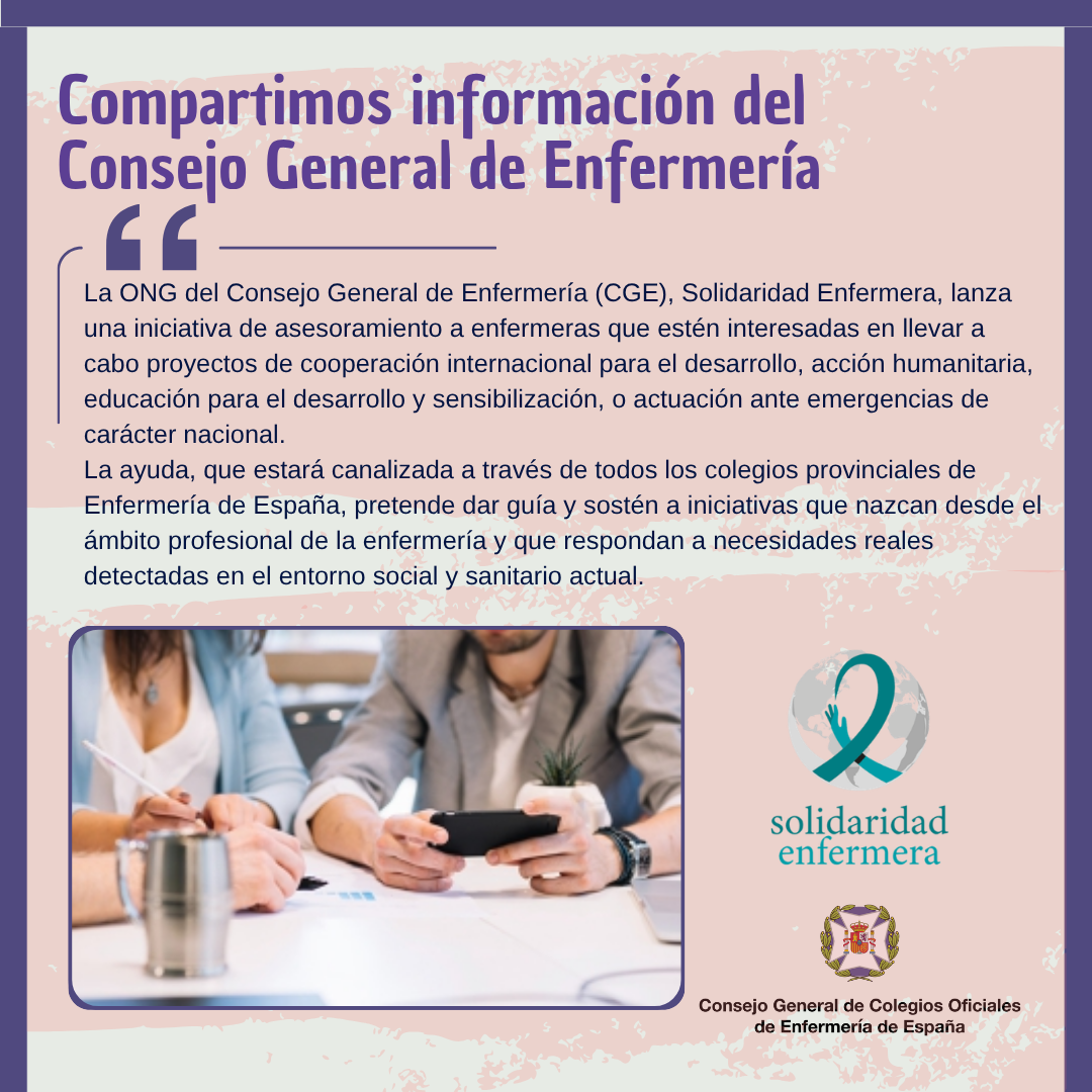 - El Consejo General de Enfermería (CGE), de la mano de su ONG Solidaridad Enfermera, pone a disposición de todas las enfermeras colegiadas en España una consultoría para ayudar a impulsar sus proyectos relacionados con la acción social. El servicio, que no conlleva coste alguno, se canalizará a través de los colegios provinciales de Enfermería.
